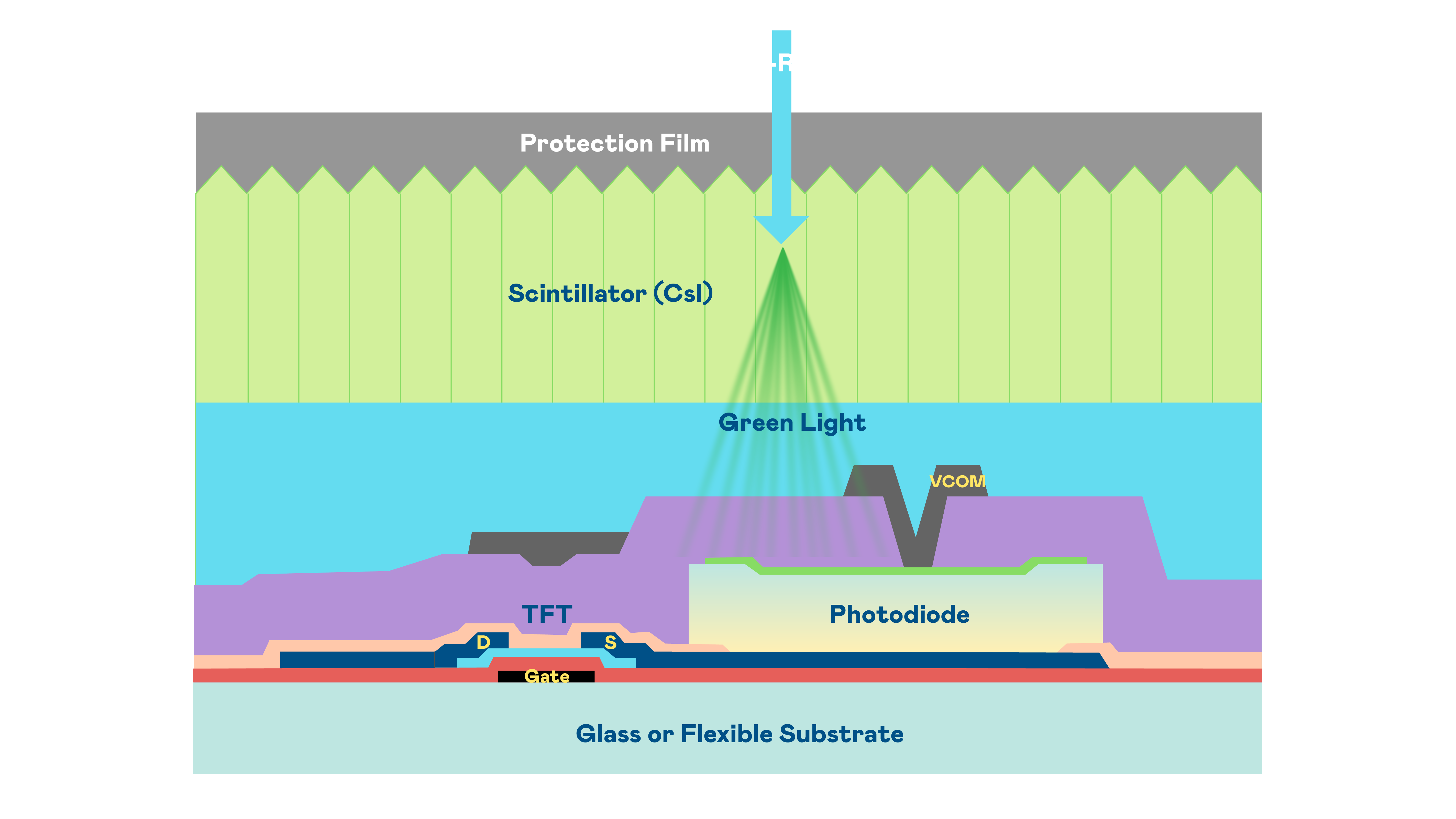 ibet的X光影像感测阵列使用薄膜电晶体 (TFT) 作为每个像素的读取开关,搭配光电二极体(Photodiode)的光电转换元件,用以感测X光影像讯号。